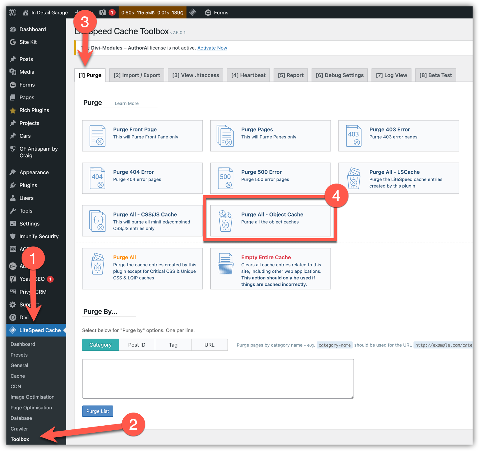 2. Navigate to LiteSpeed Cache > Toolbox > Purge