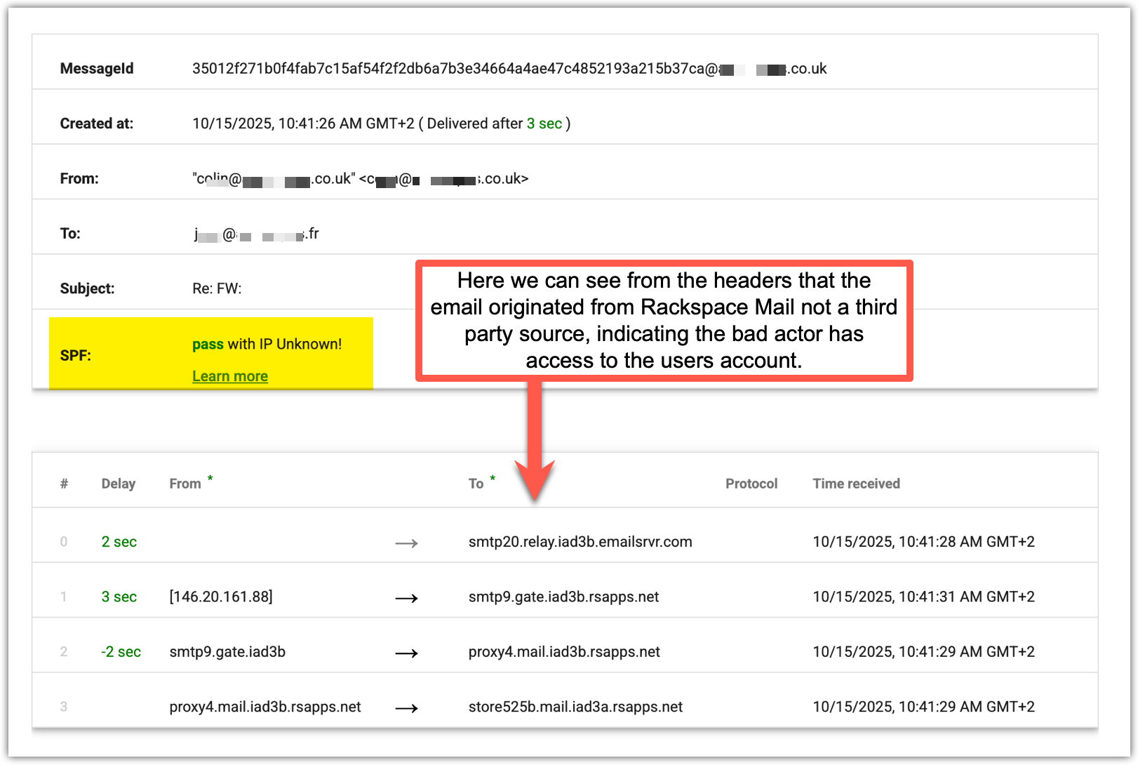 The screenshot below is an email header trace showing the message was sent through Rackspace servers: (smtp20.relay.iad3b.emailsrvr.com → smtp9.gate.iad3b.rsapps.net → proxy4.mail.iad3b.rsapps.net → store525b.mail.iad3a.rsapps.net), SPF checked as pass, and the routing stayed inside the Rackspace infrastructure, which indicates the message was sent from the legitimate a***.co.uk mail system rather than being spoofed, in other words, it strongly suggests the sender’s account or device has been compromised and was used to send the phishing page.
