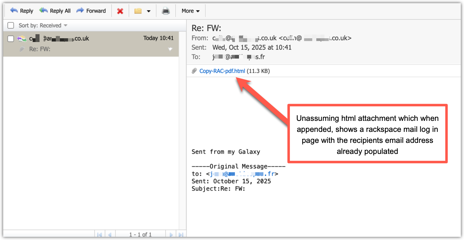 We recently observed a phishing email sent from within a client's own Rackspace Mail hosted domain (c****@a***s.co.uk) to another Rackspace Mail hosted internal address on a different domain (j***@a***s.fr). The message included an attachment named Copy-RAC-pdf.html that impersonated the Rackspace Webmail login and silently forwarded any entered credentials to an attacker via Telegram.