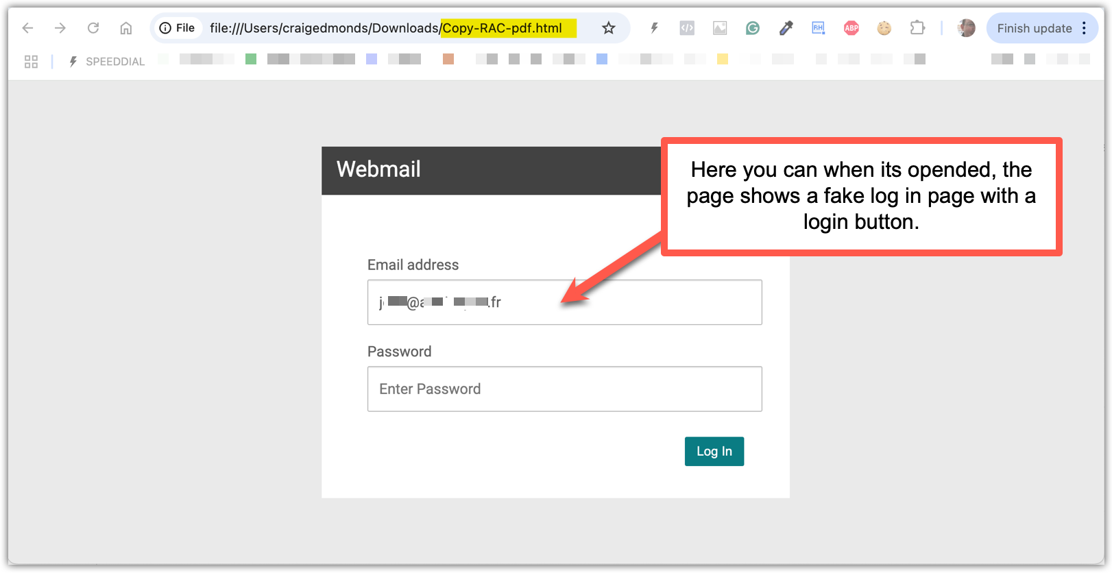 This screenshot shows what happens when the attached Copy-RAC-pdf.html file is opened. It displays a fake Rackspace Webmail login page, prefilled with the recipient’s real email address and prompting for a password. The layout looks genuine, but it’s a phishing page designed to capture any credentials entered and send them to the attacker.