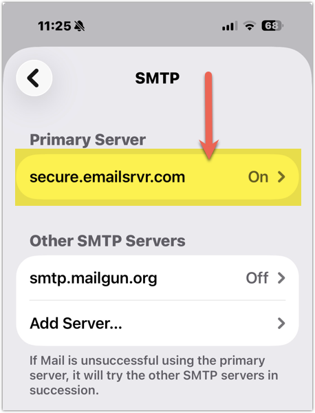 4. Your Primary Server should say "secure.emailsrvr.com". Click it to select it to view settings.