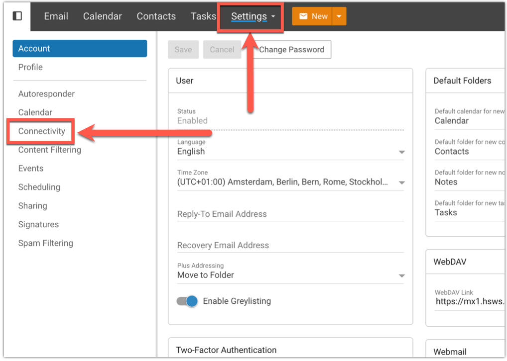 1. Log in to the webmail on the SmarterMail server and go to Settings > Connectivity