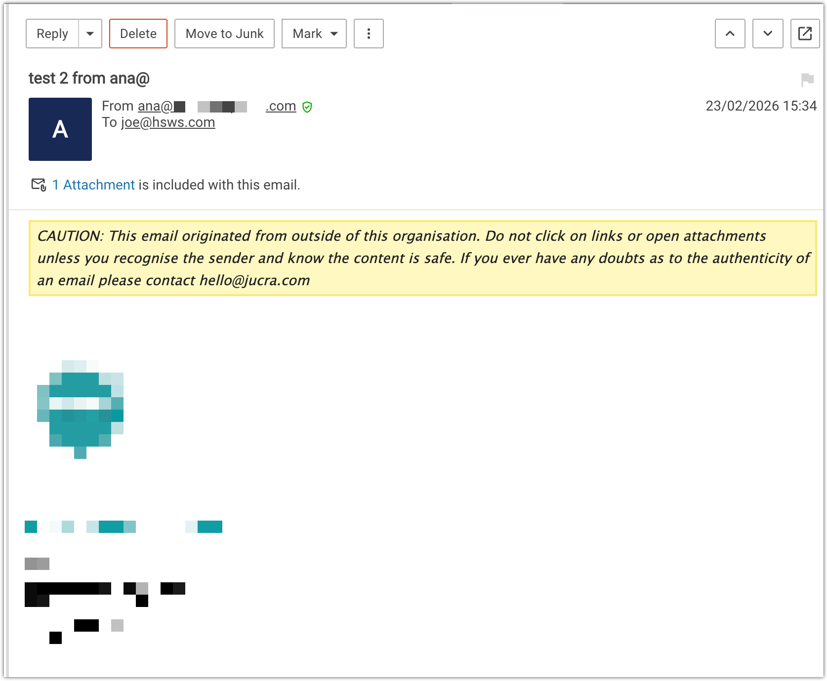 The yellow banner provides a clear visual reminder that the email came from outside your organisation so users can be more cautious when: