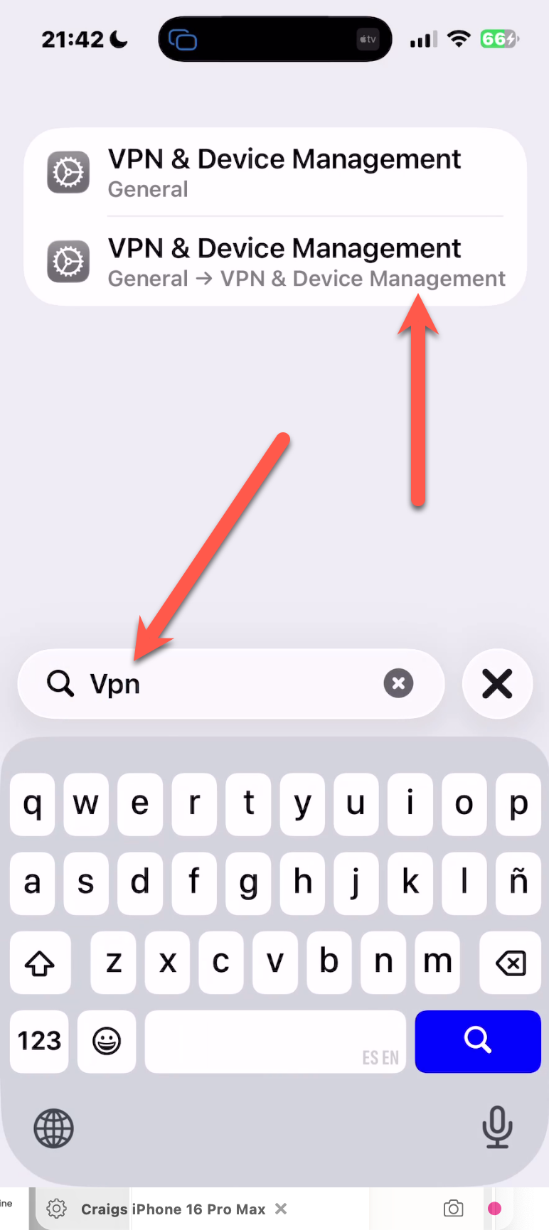 Search in the search bar "VPN" and Click on "VPN & Device Management"